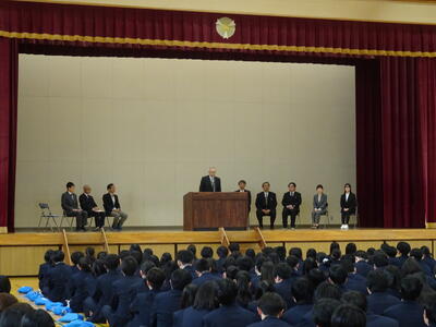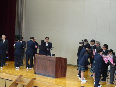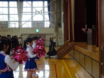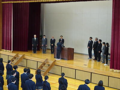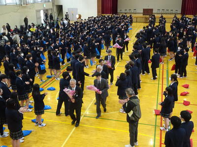 3月27日(金)に離任式が行われました。今年度は、11人の教職員が転・退任されました。式では、校長先生から転・退任される先生方を紹介の後、それぞれあいさつをいただきました。次に教頭先生から役職定年をむかえ転勤される校長先生を紹介の後、あいさつをいただきました。その後、生徒会長から送別の言葉、花束贈呈、校歌斉唱、応援団・チアリーダーによるエールと続きました。